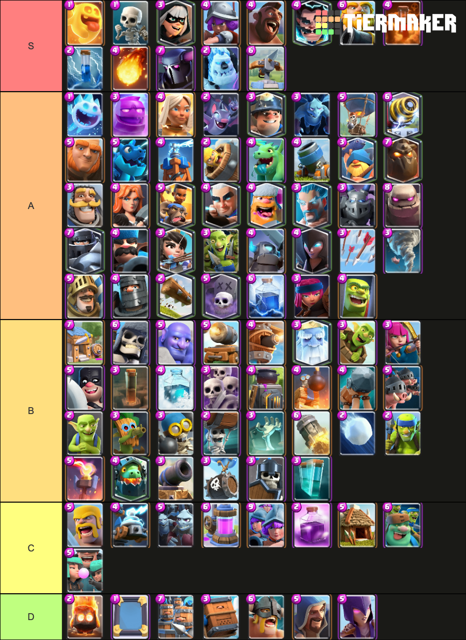 Lets start with the top 5 cards which are the main utility cards that will almost always give you an Elixir advantage in a battle. S tier basically means the card is really strong and potentially needs a nerf or maybe it doe. It is of course personal preference and some are better then others.